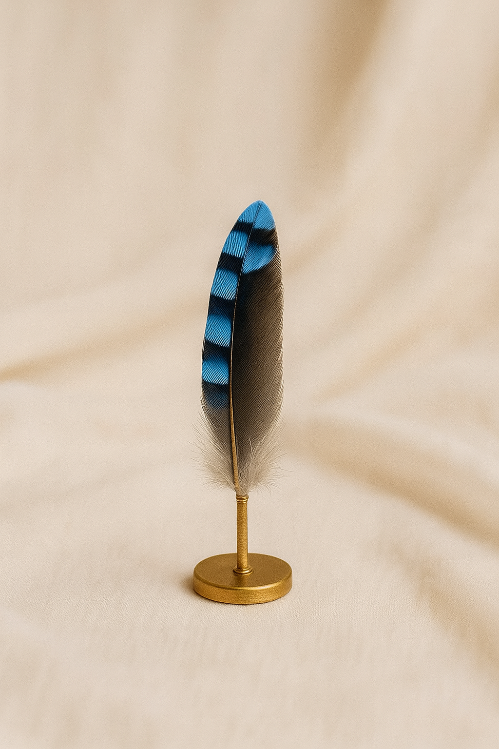 Die Eichelhäherfeder – mit ihrem leuchtenden Hell- und Azurblau – gilt seit jeher als Zeichenbringerin des Waldes. Ihre feine Struktur, die leichte Biegung und die zarten Farbschichten schenken ihr eine besondere Ausstrahlung, die kreative Projekte, Rituale und Altare veredelt.